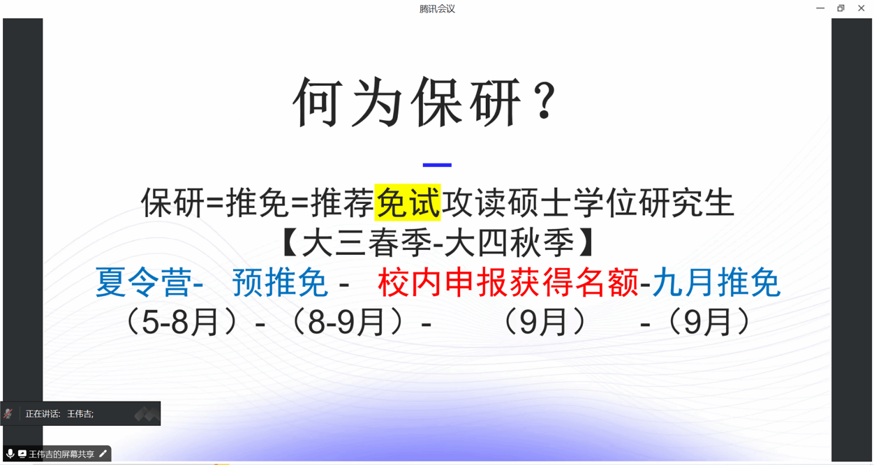 保研篇:王伟吉分享了保研的宝贵经验。他详细介绍了保研的流程,强调参与夏令营的作用、夏令营的参与流程,从获取信息、材料准备、提高竞争力的方法等多方面进行自己的经验分享。