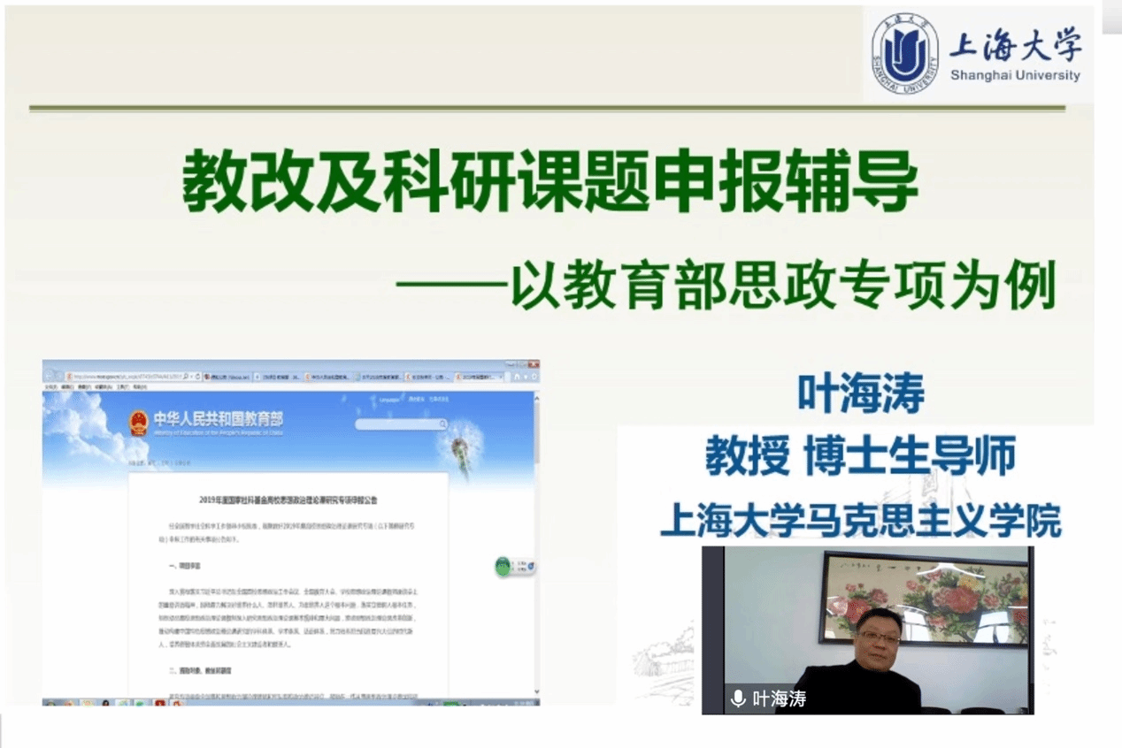 近期,全国高校正在组织申报各类国家级与省部级的科研、教改和教研项目,买球官方网站文科处已相继发布《2023年度教育部人文社会科学研究一般项目申报工作的通知》、《关于2023年度高校思想政治理论课教师研究专项一般项目申报工作的通知》等多项公告,要求相关院系的教师申请人根据自身的研究基础和教学特长,坚持正确政治方向、价值取向、研究导向,认真凝练主题,积极参与申报。为进一步推动学院相关课题申报工作的顺利展开,提高青年教师课题申报的技巧与方法,学院青年教师联合会(青联会)4月1日上午特邀买球官方网站主持工作副院长叶海涛教授在学院502会议室作专题报告,各位青年教师采取线上(腾讯会议)与线下相结合的方式参加了此次培训活动。 叶海涛教授通过“教改及科研课题申报辅导——以教育部思政专项为例”的报告,为学院青年教师详细讲解了教改与教研课题申报概述、思政专项课题类别、教育部思政教师专项申报,以及课题申报过程中需要注意的事项和细节。首先,通过概述教改与教研课题的申报环节,叶海涛教授列举了科研、教改和教研项目中的三个典型案例,着重强调了不同课题项目的侧重点与落脚点。然后,基于思政专项课题的要求,叶海涛教授全面解析了“2020年度高校思想政治理论课教师研究专项”的立项情况,并且结合今年的申报工作通知进一步剖析了四类高校思政课项目的申报难度、课题特点以及注意事项。最后,关于教育部思政教师专项申报,叶海涛教授要求申报者仔细阅读《申报通知》与《课题指南》,认真填写《申报书》与《活页》,熟悉整体设计,做到心中有数。 叶海涛教授的报告结束后,学院广大青年教师于线上和线下积极提问,针对课题项目申报中遇到的各种问题深入交流,并且纷纷表示在此次专题培训活动中受益匪浅,感谢叶海涛教授能将自身经验倾囊相授。学院青联会也将以此次专题培训活动为契机,努力解决青年教师在科研与教学上的迷思、困惑和难题,奋力加快青年教师在学院各项工作中的进步和成长。