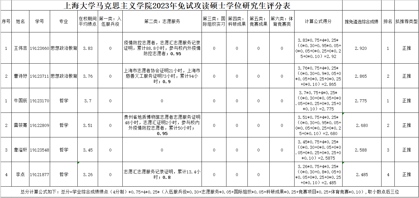 根据教育部关于做好2023年推荐优秀应届本科毕业生免试攻读研究生工作的相关文件的要求及《买球官方网站2023年推荐应届优秀本科毕业生免试攻读硕士学位研究生工作实施办法》上大内〔2022〕99号、《买球官方网站关于做好2023年推荐应届优秀本科毕业生免试攻读硕士学位研究生工作的实施方案》等文件相关精神,学院推免工作小组以学生在校期间所有本科课程的平均绩点为基础,综合考虑入伍服兵役、志愿服务等六类全面发展指标的表现,进行综合打分排序,产生买球官方网站2023年拟推荐应届优秀本科毕业生免试攻读硕士学位研究生名单,公示如下: