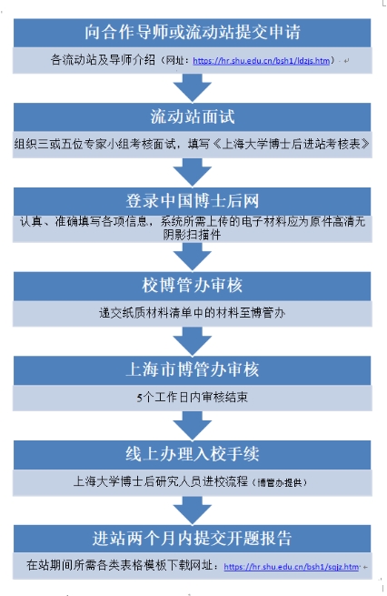 福利待遇 1.在站期间基本年薪22万/年,团队或合作导师增加补充薪酬。入选上海市师资博士后、上海市超级博士后资助,年薪可达28万、37万。 2.按照国家规定缴纳五险一金,办理子女入学入托,享受年度体检、工会等教职工福利。 3.在站期间可申请副高级专业技术职务任职资格评审,通过者优先推荐留校工作,入校后可按高级专业技术职务聘任。 申请进站流程