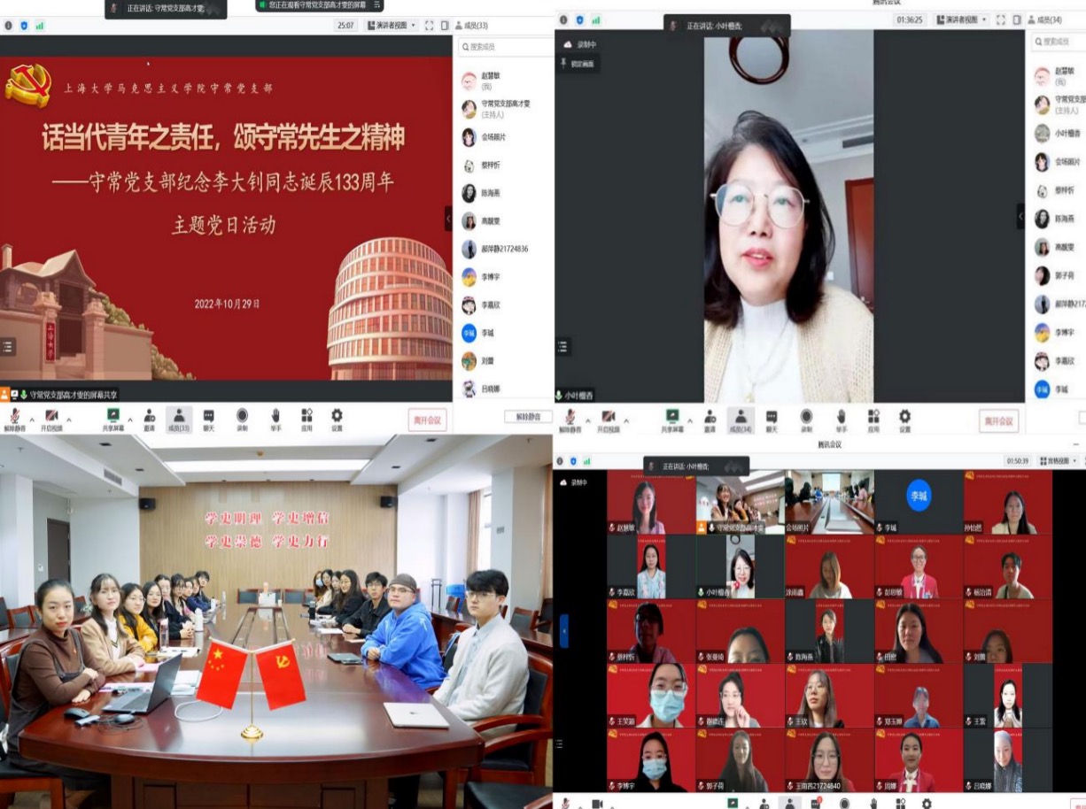 (支部成员集体诵读《青春》) 《青春》写于1916年,27岁的李大钊由季节上的春天想到了人生命中的春天、民族命运上的春天,他渴求中国能摆脱衰弱腐朽的局面而重新找回国家命运上的春天。于是,李大钊执笔写下《青春》,他极其希望能通过文字的力量唤醒众多青年学子冲破网罗、去除陈腐、发愤图强,保持朝气蓬勃的精神,在风雨如磐中担起民族救亡图存重任。时至今日,再诵读《青春》一文,字里行间,慷慨激昂,无不透着革命精神的火热,仍激励当代青年学子:应锐意进取、不懈奋斗,置身在无极无尽的洪流中,应该持有江水奔流到海不复回的精神,巍巍高山雄伟独立的气魄。 三、话感悟:追忆先生事迹,话当代青年之责任 上午10:00,守常党支部特别邀请李大钊曾外孙女李晓莉女士交流分享。买球官方网站党委副书记、副院长张高峰,上海市中共党史学会渔阳里研究专委会会长、买球官方网站教授李瑊,买球官方网站团委副书记、学院学生党建中心主任、研究生辅导员谢德连以及守常党支部全体成员参与座谈。本次分享会采取线上线下结合的方式,由支部书记高才雯主持。