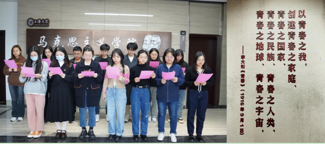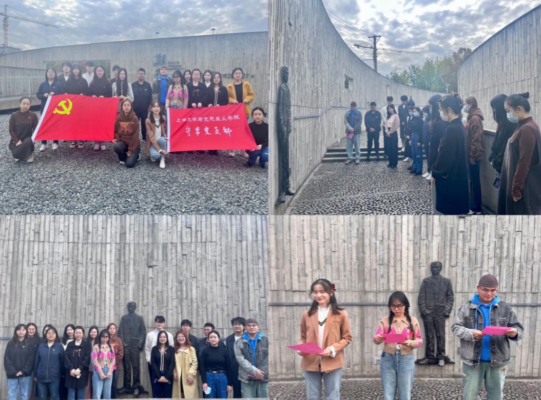 “黄金时代,不在我们背后,乃在我们面前;不在过去,乃在将来。”百年前,以李大钊为代表的革命先辈齐聚上大,播撒下红色火种,将共产主义的星星之火,洒遍青年知识分子心间。百年后,守常先生的谆谆教诲言犹在耳,指引着一代代莘莘学子勇肩使命,赓续奋斗精神的薪火相传。2022年10月29日是中国共产主义运动的先驱、伟大的马克思主义者、中国共产党的主要创始人之一——李大钊同志诞辰133周年纪念日,在这个特殊日子,买球官方网站守常党支部开展了“话当代青年之责任,颂守常先生之精神”——纪念李大钊同志诞辰133周年主题党日活动。支部党员通过游溯园、诵《青春》、话感悟等形式追忆革命先烈李大钊,表达对守常先生的缅怀之情。 一、游溯园:回望峥嵘岁月,再忆英雄精神风骨 上午8:30,守常党支部全体党员于买球官方网站溯园举行李大钊先生的纪念活动,支部党员怀着无比敬仰的心情瞻仰了李大钊先生的浮雕,通过诵读李大钊先生的名句,共同回望百年前革命先辈的峥嵘岁月,再次追溯李大钊先生的英雄精神风骨。 溯园是一座形如年轮般的弧形建筑,如其名“溯园”意在“追根溯源”,它回环曲折的墙体上静静地镌刻着李大钊在买球官方网站演讲时的经典场景。守常党支部从石子铺就的入口处走进溯园,凹凸不平的小路带着悼念守常先生的思绪,一起飘回了那个风云变幻的年代:百年前,岁月激荡,山河飘摇,民族危机,千钧一发;他,将国家命运背负于身,将民族安危皆系于心,点燃了无数中国青年心中的烈火,救国家于危亡。