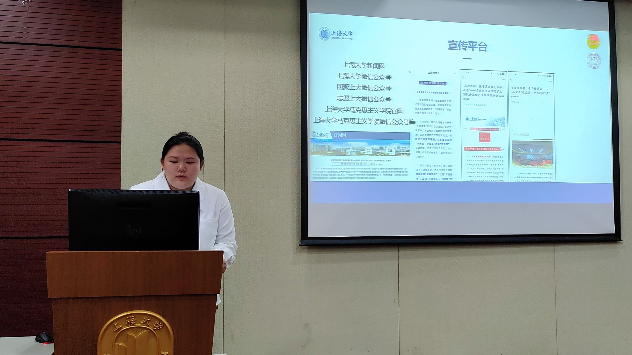 第六届青马研习会主席团成员陈鹏吉从“社团建设”、“社团活动”、“荣誉”等方面对2022~2023年青马研习会的工作进行了全面总结。陈鹏吉先是带领大家回顾了社团的理念、宗旨、定位、架构、标识等社团基础信息,随后她依次介绍了青马研习会在过去一年内所组织举办的各项活动,从“党的二十大精神宣讲团”的成立及校内外宣讲,到赴湖州市安吉余村、德清五四村等红色调研,以及真理的力量——纪念马克思诞辰200周年主题展等,作为“2022年度上海高校活力社团”与“2022年度买球官方网站优秀社团”,她坚信,青马研习会将始终以“踔厉奋发、挺膺担当”的良好精神风貌大步前行。