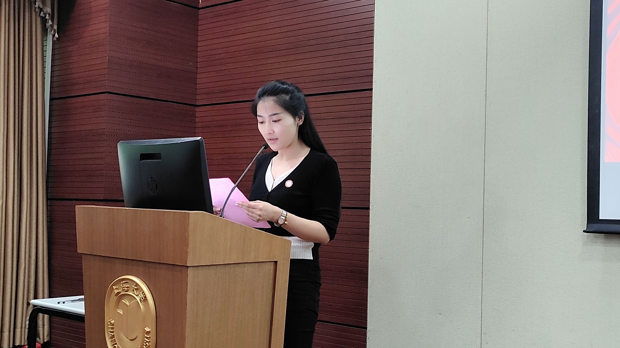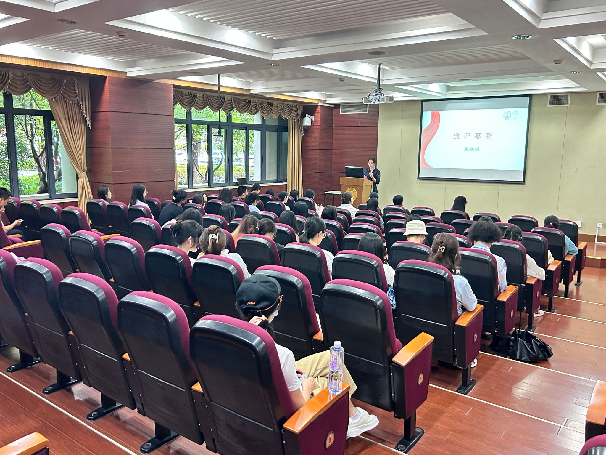 国歌声响起,换届大会正式拉开序幕。陈晓娟为大会致开幕辞。她从青马研习会的特色品牌活动——“真理之光 信仰之源”专项读书会、“真理之声”红色教育音频栏目、红色大寻访和“青马之声”时政宣讲团等入手,以青马研习会过去一学年所获得的累累成绩,勉励在座新老成员积极做好新时代青年马克思主义者,努力发声,为传扬马克思主义理论贡献青春力量。