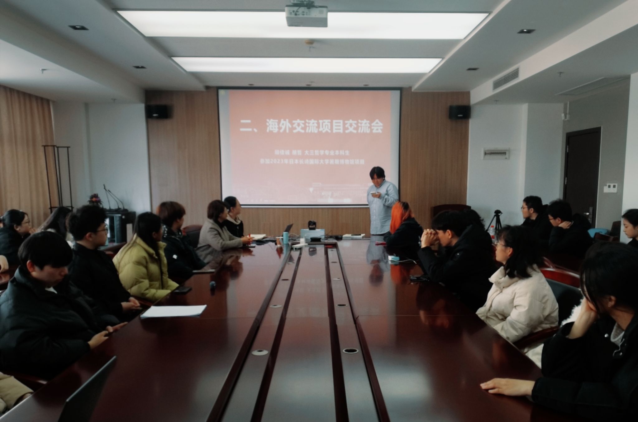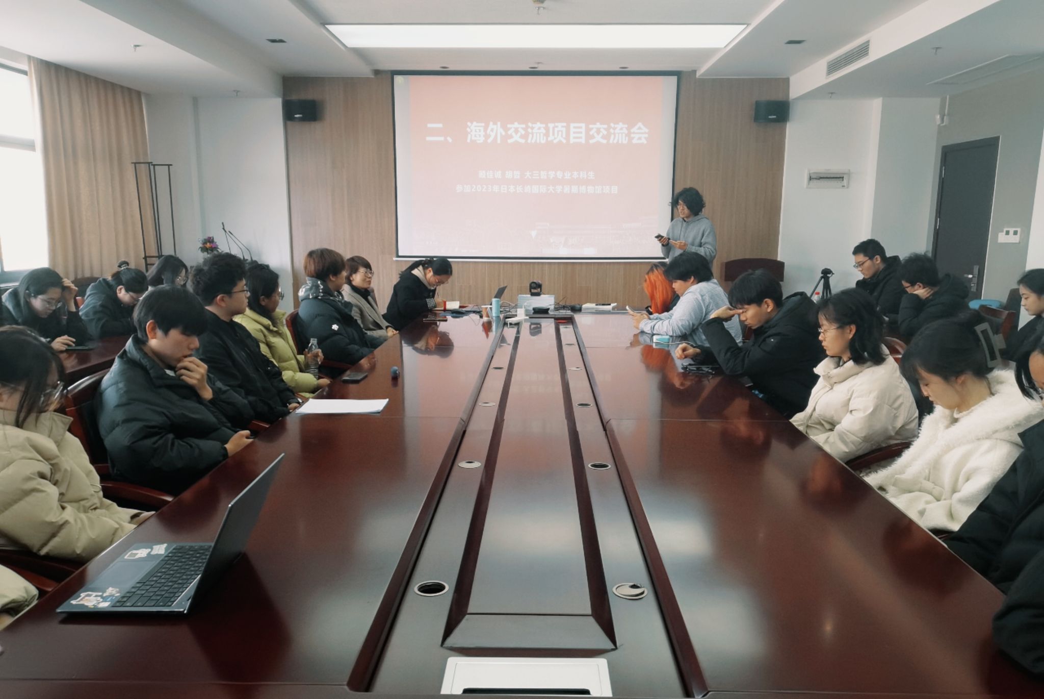 接着,张欣怡同学作“2023年日本千叶大学交换留学项目”的经验分享。她从交流前准备、交流中规划、出国注意事项等三个方面介绍,特别对出国留学中遇到的诸多困难和挑战,逐一分享了解决办法和对策。顾佳诚、胡哲、郭玥三位同学分别就2023年日本长崎国际大学暑期博物馆学研修与实习项目”和“2024年联合国驻日内瓦总部实地交流项目”短期海外交流项目,生动地分享在日本长崎、瑞士等地的学习收获、实践锻炼和生活体验。出国交流学习是一个不可多得的开拓眼界的机会,不仅增长专业知识,更是体验不一样的文化氛围,收获别样的人生经历。相信此次的经验分享交流,一定能在同学们心中种下一粒“心动”的种子,激励有计划的同学们早准备、早行动。