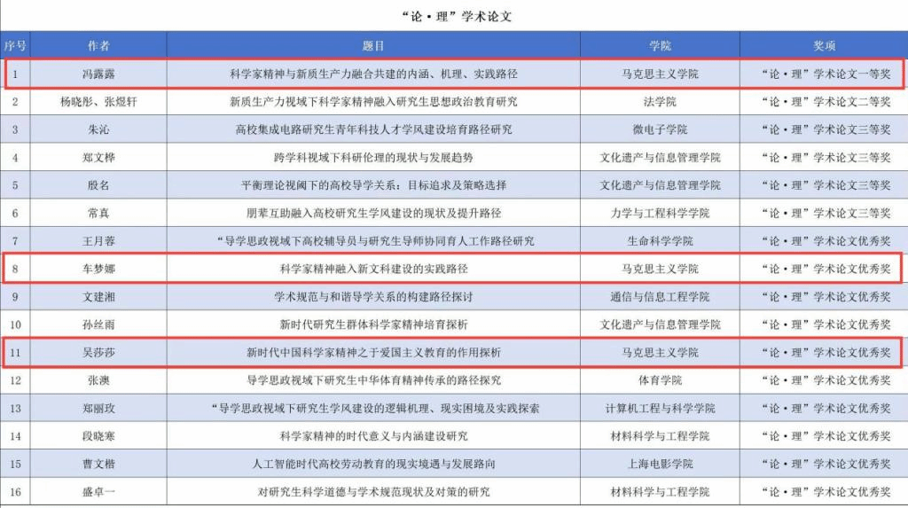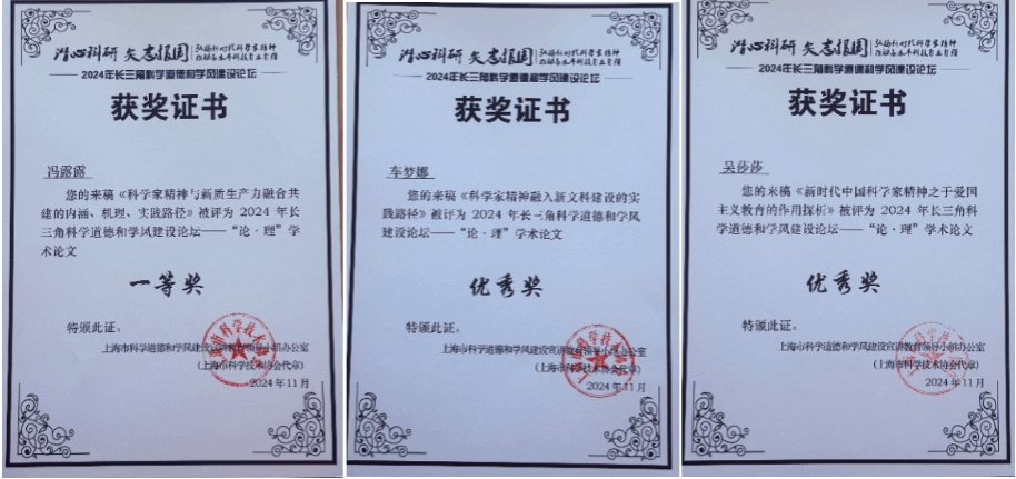 11月9日,由上海市科学技术协会、上海市教育委员会指导,上海市科学道德和学风建设宣讲教育领导小组办公室、上海市学位委员会办公室主办的“潜心科研 矢志报国——弘扬新时代科学家精神,推动高水平科技自立自强”2024年长三角科学道德和学风建设论坛在上海理工大学举行。 本次论坛共收到52家高校、科研院所投稿作品总计972份,共评出205篇“论·理”优秀学术论文。买球官网学子在本届论坛中取得佳绩,共获得3项荣誉,其中冯露露同学获评“论·理”学术论文一等奖;车梦娜同学、吴莎莎同学获评“论·理”学术论文优秀奖。