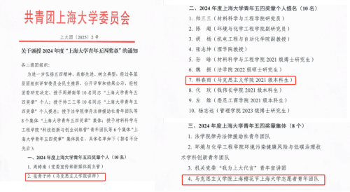 近日,共青团买球官方网站委员会下发了《关于颁授2024年度“买球官方网站青年五四奖章”的通知》(上大团〔2025〕2号),买球官网副教授张青子衿老师获“2024年度买球官方网站青年五四奖章个人”,2021级本科生韩春雨获“2024年度买球官方网站青年五四奖章个人提名”,买球官方网站上海樱花节买球官方网站志愿者青年团队获“2024年度买球官方网站青年五四奖章集体”。