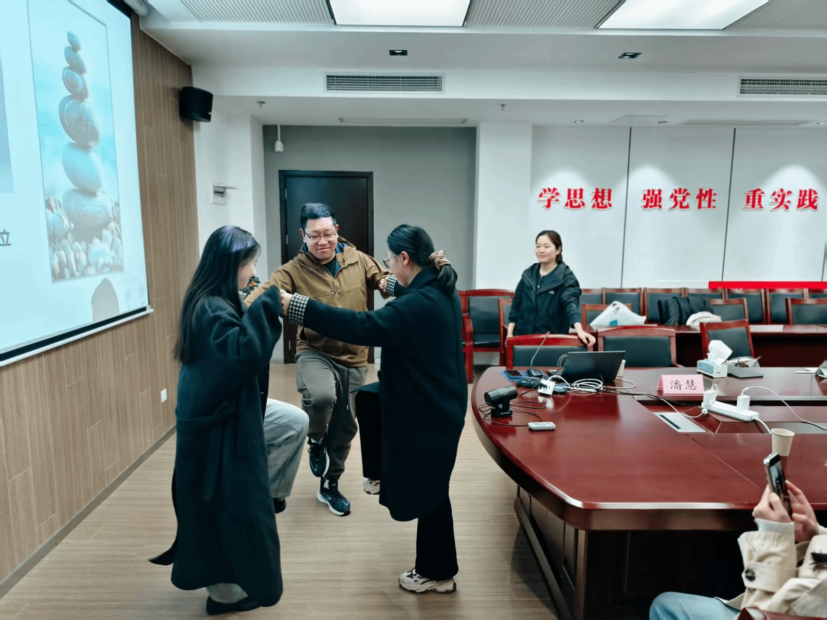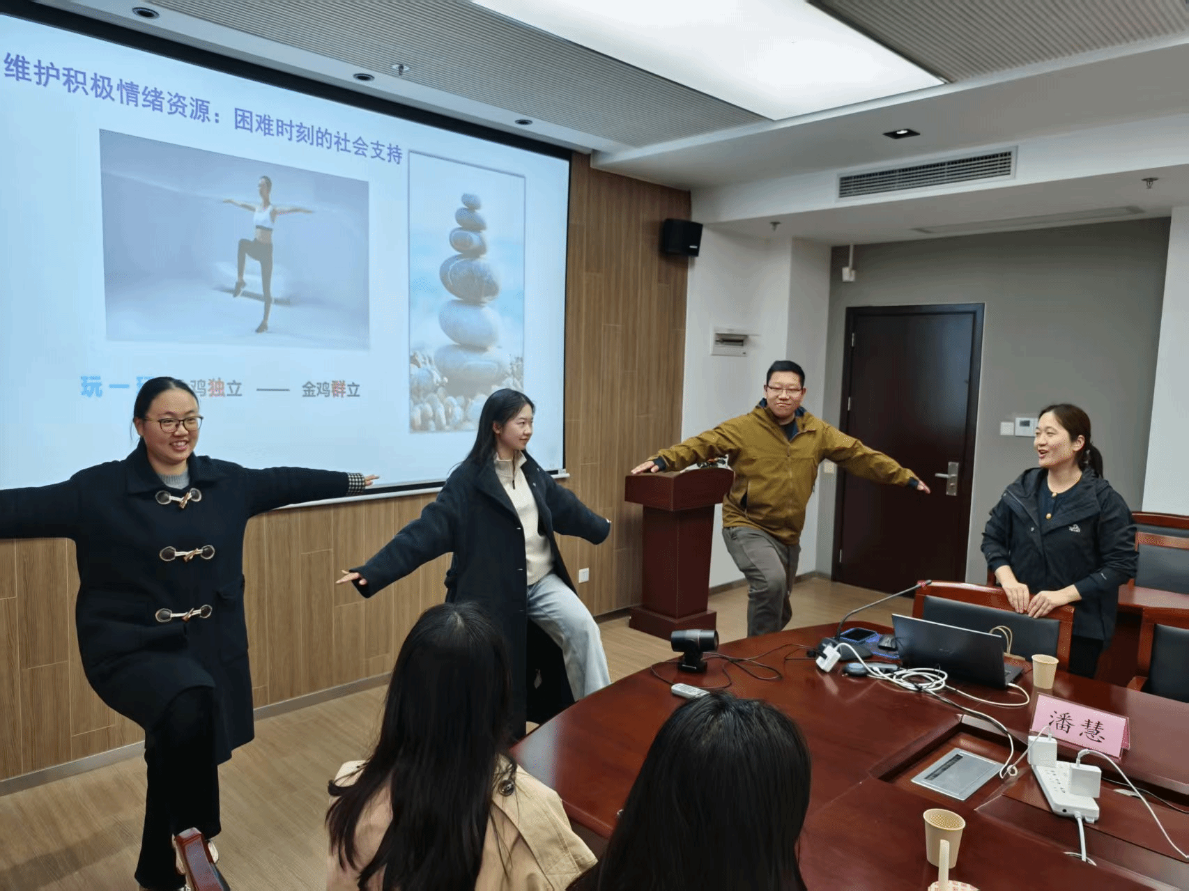 此外,潘老师还分享了调节自身情绪和排解压力的具体方法,并邀请在场的师生参与体验。如五感减压放松法,缓解睡眠问题的4-7-8呼吸法以及管理冲动情绪的STOP技巧。最后,潘慧老师通过“金鸡独立”和“金鸡群立”的小游戏形象生动的传达了群体支持是个人度过困难时刻的重要情绪价值来源。