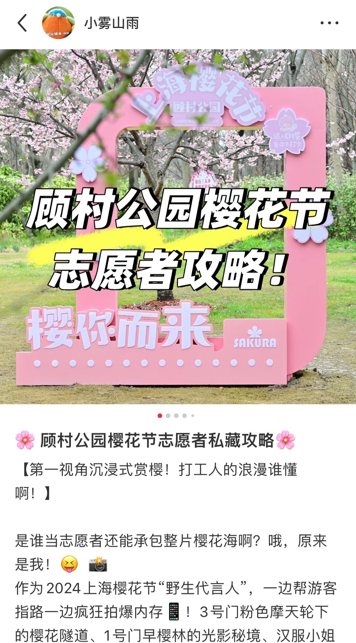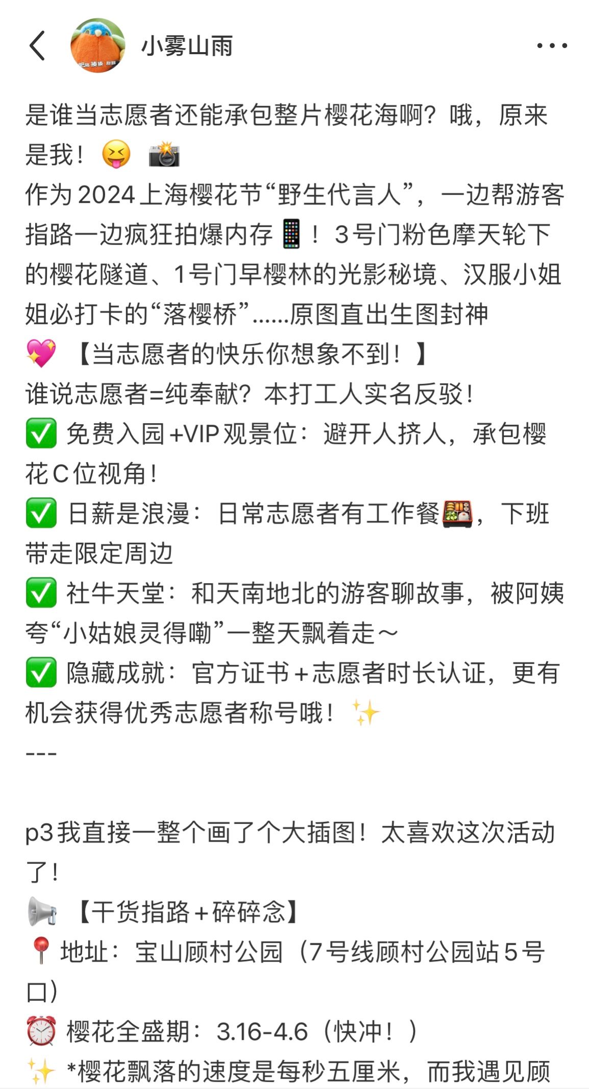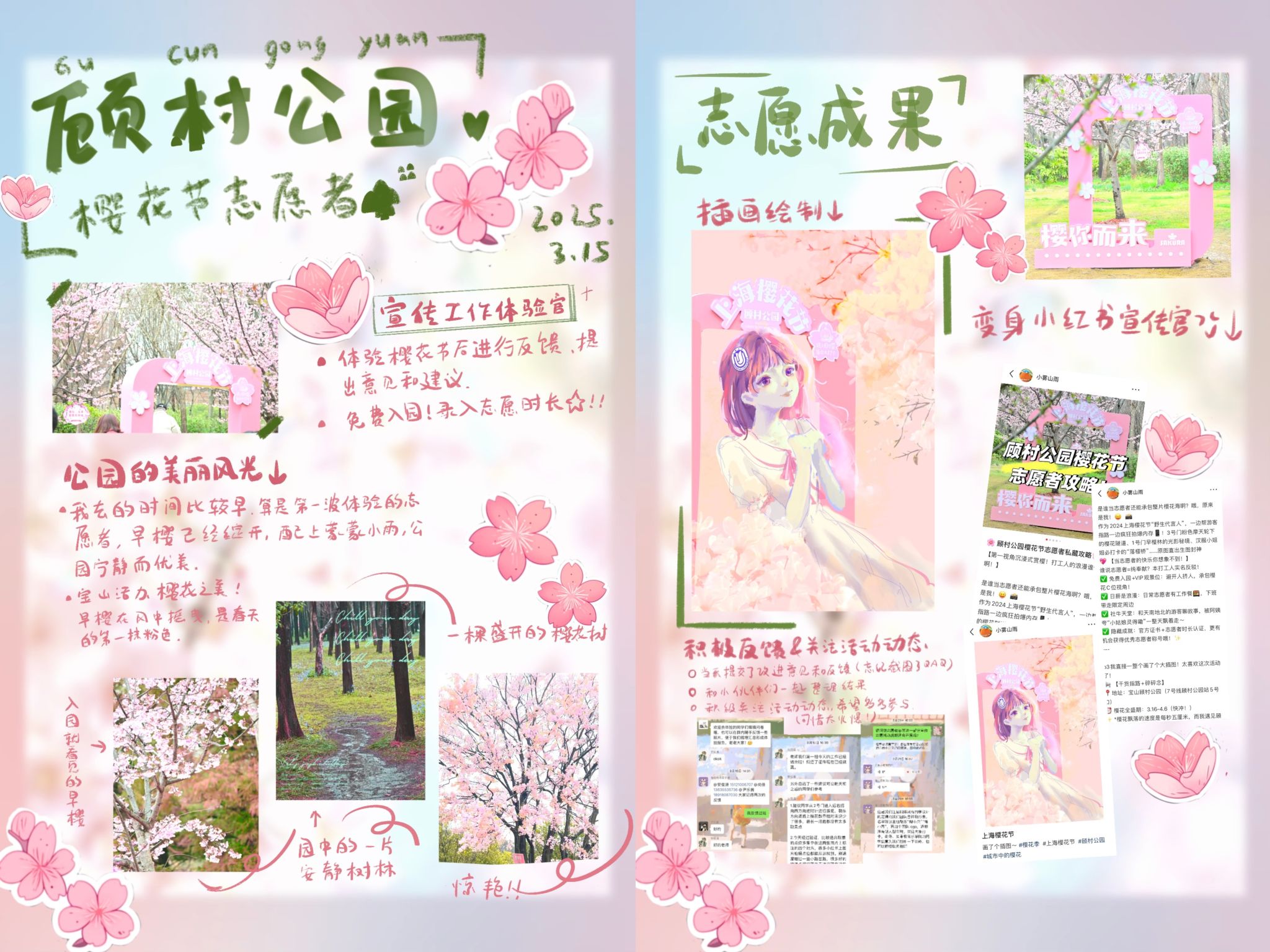 (志愿者手账作者:2023级上海美术学院研究生尚佳) 此外,宣传专项组志愿者发挥创意,通过撰写小红书文章、绘制手绘漫画等形式,生动分享个人经历与公园游玩指南,以鲜活有趣的方式吸引了更多年轻人关注并投身志愿服务,激发社会大众责任感。 三、樱瓣落处见初心,青春接力向未来 志愿者心得: 买球官方网站2023级本科生李云娇: 今年,我有幸参加了顾村公园樱花节志愿服务,主要负责引导游客换票、指路等工作。虽然工作时天气有些炎热,身体有些疲惫,但每当听到游客真诚的“谢谢”,看到他们开心游玩时的笑容,所有辛苦都化作满足。更让我感动的是团队的合作精神。面对不熟悉的问题时,队友们总是主动帮忙,耐心指导,让我感受到集体的温暖。这次经历不仅让我学会了如何高效沟通、灵活应变,更让我明白志愿服务不仅是付出,更是收获——收获信任、友谊和成长。 环化学院2023级硕士研究生田博中: 在公园服务时,突然有一位游客在我面前摔倒。那一刻,我脑海里没有任何迟疑,看到身旁路过的医生模样的游客,立马与他默契配合,对摔倒的游客展开简单急救。期间,我迅速拨打了顾村公园警务处电话,报告现场情况。等待救护车的过程,每一秒都无比漫长。直至救护车将游客接走,紧绷的神经才得以放松,这时我才惊觉,后背早已被冷汗湿透。这件事虽小,却意义重大。身为一名青年党员,又是樱花节的志愿者,很荣幸能为游客提供了及时帮助,未来我也将继续践行志愿服务精神与青年党员的担当。那天,顾村公园的樱花美得格外动人。 文学院2023级本科生郁佳莉: 我的主要工作是在热门游乐项目入口维持秩序,为游客解答疑问,引导他们安全、有序地游玩,同时还要关注小朋友们在快乐中的安全问题。这段志愿者经历,不仅锻炼了我的沟通能力和应变能力,更让我懂得了付出与奉献的意义。看着孩子们在乐园里尽情欢笑,我明白自己的每一分努力都在为他们创造美好的回忆。未来,我希望能继续以志愿者的身份,传递温暖与关爱,见证更多的幸福时刻。 2025年上海樱花节买球官方网站优秀志愿者公告 经自主申报,组长评分、组内互评及组织方评分等综合测评后,现评选出135名2025上海樱花节买球官方网站优秀志愿者,名单公布如下(排名不分前后)。 附:2025上海樱花节买球官方网站志愿者名单(详见“买球官方网站”微信公众号相关推文)