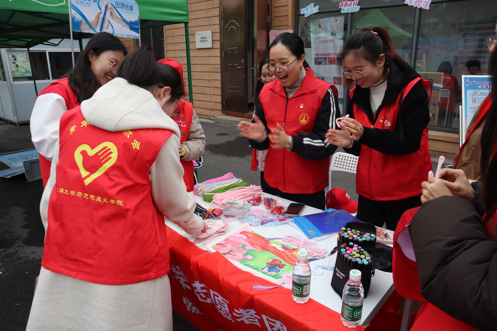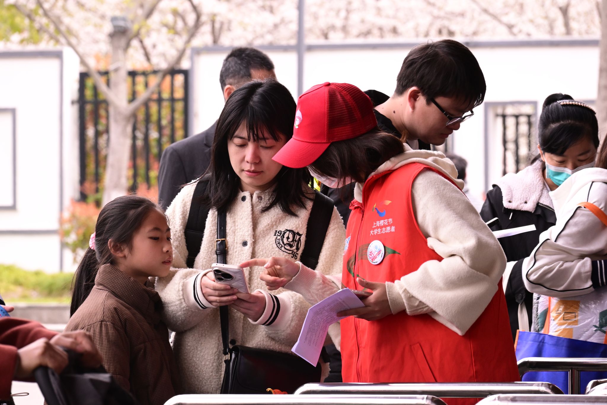今年2月,随着樱花节志愿者招募推文的发出,短短几天,组织方就收到了900余份报名表。经过严格的线上面试选拔,最终551名志愿者成功脱颖而出。 在正式上岗前,组织方为各位志愿者提供全方位的“线上+线下”培训。培训内容丰富多样,包括活动流程、景区布局、应急处理、语言沟通等。青年志愿者们在理论知识的学习中充实自我,在实践演练中不断提升能力,完成了从“志愿新兵”到“文明使者”的华丽蜕变。 二、步履不停,温暖相伴:在花海中书写服务篇章 3月8日—4月6日的11个假期服务日里,志愿者们每天迎着清晨的第一缕朝霞上岗,直到太阳西沉,披着晚霞才踏上返程之路。在顾村公园的每一寸土地上,都留下了他们忙碌而坚定的足迹。 公园二号门入口处,志愿者们耐心地为游客讲解预约流程,手把手帮助老年游客操作智能手机,确保每一位游客都能顺利入园。宣传组志愿者们扛着相机,不放过任何一个暖心瞬间,用镜头记录下了志愿服务中的点点滴滴;后勤组志愿者们不辞辛劳,往返数公里为同伴送去餐食,保障大家的基本需求;临时党支部成员则充分发挥先锋模范作用,在“志愿者之家”开展党史微党课,将理论学习巧妙地融入服务实践中。