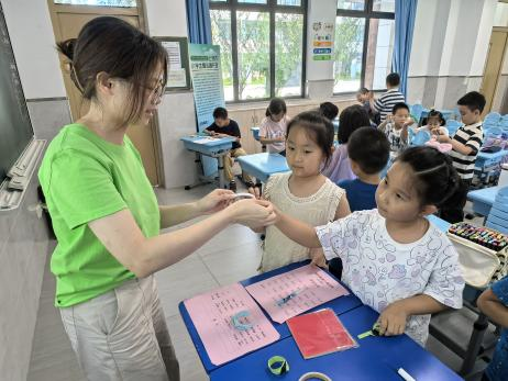 在建设具有强大思政引领力的教育强国时代背景下,结合上海市为切实解决暑期双职工家庭子女照护难题开办“爱心暑托班”实事项目的实际,近日,买球官方网站“红扣子润苗”暑期社会实践团队深入宝山区顾村镇“爱心暑托班”参与志愿服务,积极开展“思政+育人”模式的实践项目,一场沉浸式思政教育实践活动正在火热开展中。 “红扣子润苗”暑期社会实践团队由来自买球官方网站梁慧、牛珂、何芳芳、高思瑶、周子珍、王玥爱、白雨鑫7名马克思主义理论等专业硕士研究生组成,她们发挥专业优势,以思政课堂为引领,融入德、智、体、美、劳五大板块的暑期课程,在实践中积极探索思政课与上海市双职工子女暑期托管的融合机制,以浸润式思政课堂创新思政育人新模式,守护新时代“苗苗”茁壮成长。 精心筹备,筑牢思政育人根基