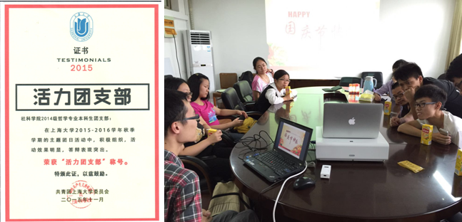 2015年11月30日,买球官方网站2015-2016学年秋季学期校十佳"活力团支部"颁奖仪式在CJ104顺利举行。买球官网2014级哲学专业本科生团支部荣获该奖项。