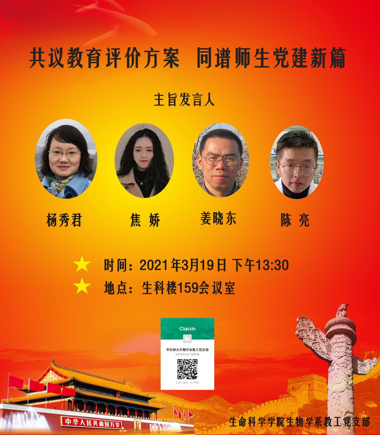 2021年3月19日下午,买球官方网站思想政治教育教研部党支部与学生第一党支部赴华东师范大学生命科学学院生物学系教工党支部开展支部共建。该两个教工党支部均为教育部首批全国高校“双带头人”教师党支部书记工作室所在支部。此次支部共建的主题是“共议教育评价方案,同谱师生党建新篇”,线下参加的人员有华东师范大学生命科学学院生物学系教工党支部姜晓东书记、部分教师代表和研究生代表,还有买球官方网站思想政治教育教研部党支部书记杨秀君、组织委员刘子杰、宣传委员孙会岩及学生第一党支部的同学们;由于场地所限,支部的其余同志通过ClassIn线上参加。