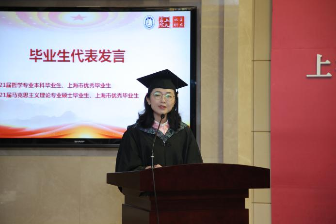 光阴数载,道不尽院、部温柔;二十而志,当接续砥砺奋斗。离别之际,毕业生们饱含对学院、对老师的感恩之情,表达了“把论文写在祖国大地、用实干投身四海神州”的壮志豪情。2021届哲学专业本科毕业生、上海市优秀毕业生刘珂然发言,她回顾了与老师开放探讨学术问题、与同学并肩学习奋斗的四年大学生活,她说自己不仅获得了自身的成长,还见证了学校的发展。她认为哲学对她来说是一片广阔深邃的海,包容并支撑着她全部的生活,哲学是拨动在生活胸腔里的心脏,充满无限可能,由此表达了对哲学的无限热爱。她说,她的成长得益于学校、学部的培育,离不开老师、同学的帮助与关怀,她向学校、学部表达了最诚挚的感谢和最美好的祝福。