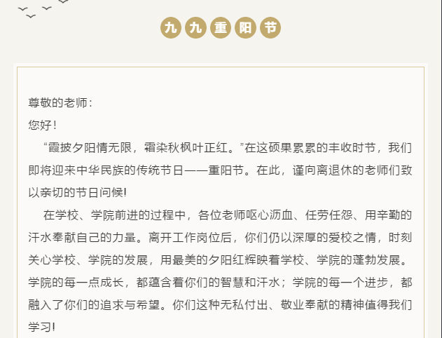 “霞披夕阳情无限,霜染秋枫叶正红”。又是一年重阳节来临之际,结合目前疫情防控形势和学校的相关要求,买球官方网站采取了多种形式,灵活开展敬老节相关活动,以弘扬尊老敬老、爱老助老的中华民族传统美德,表达对离退休老教师的关爱和感激之情。 学院坚持为老教师们办实事、做好事、解难事,保障敬老补贴1:1配备到位,同时对于高龄、重病老教师,学院配备了专门慰问金。学院还给每位老教师发放了一封慰问信,感谢老教师们曾为学院发展做出的贡献,也传递了学院对老同志的关心和关怀。