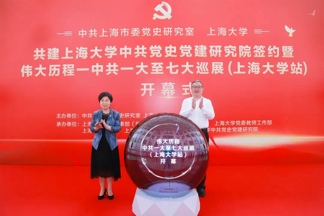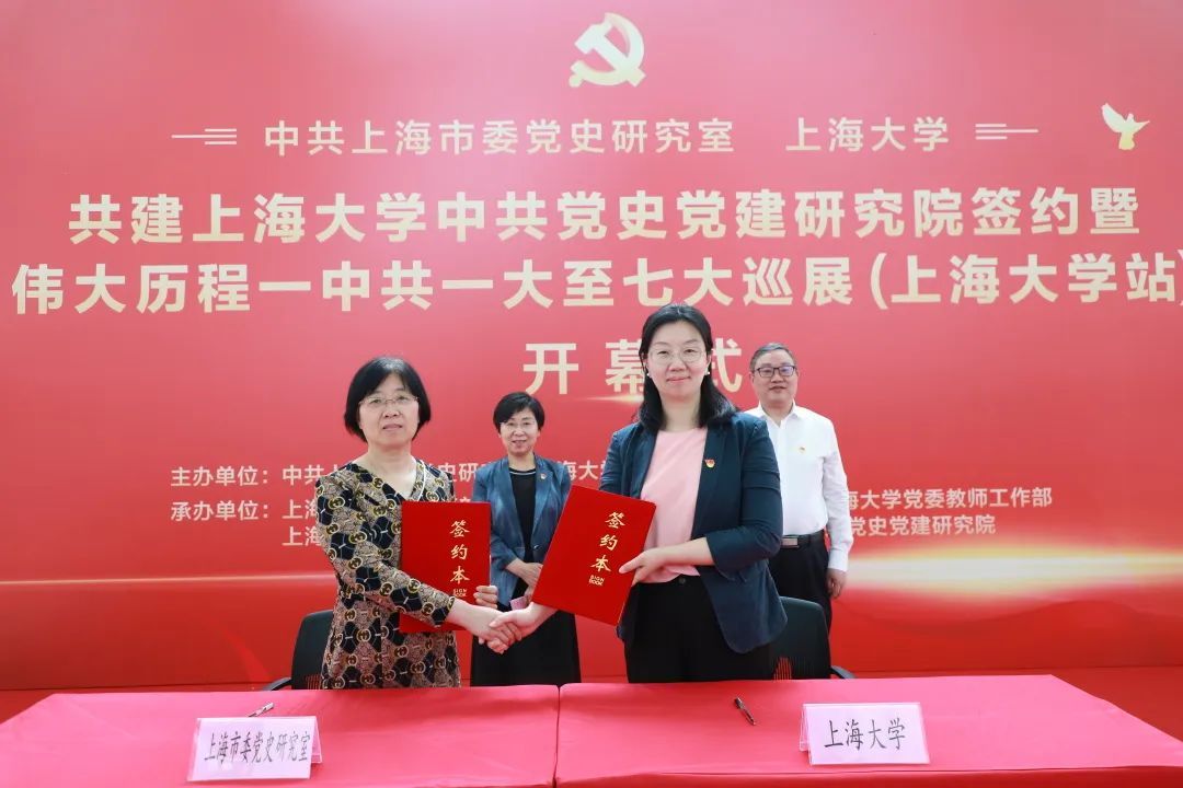 为推动学习贯彻习近平新时代中国特色社会主义思想主题教育走深走实,进一步学习宣传贯彻党的二十大精神,合力构建大党史工作格局,6月12日上午,中共上海市委党史研究室与买球官方网站共建买球官方网站中共党史党建研究院签约仪式暨“伟大历程——中共一大至七大巡展(买球官方网站站)”开幕式在买球官方网站本部图书馆五楼展厅举行。