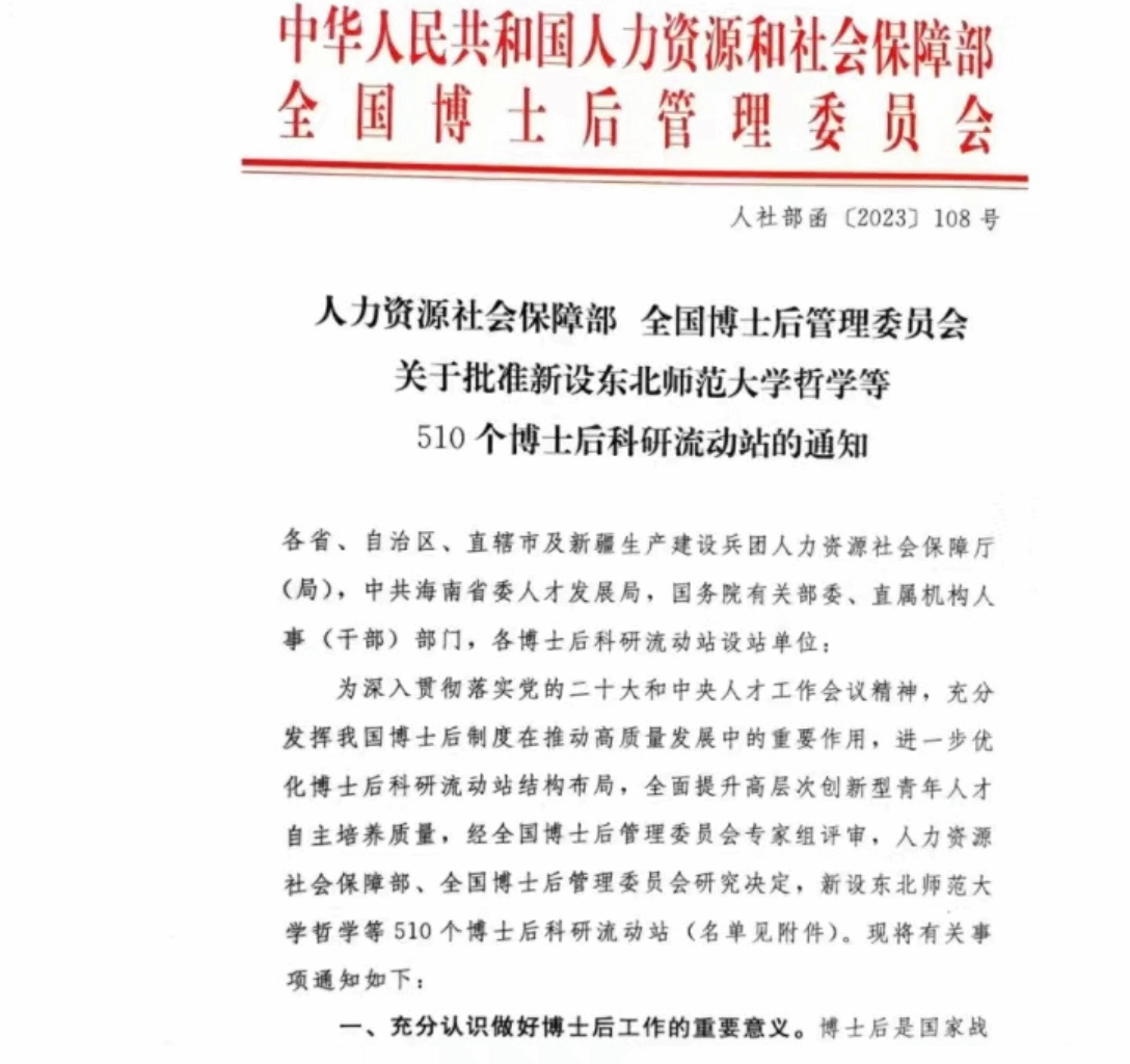近日,人力资源社会保障部、全国博士后管理委员会联合下发《关于批准新设东北师范大学哲学等510个博士后科研流动站的通知》(人社部函〔2023〕108号)。买球官方网站马克思主义理论博士后科研流动站获批准设立。