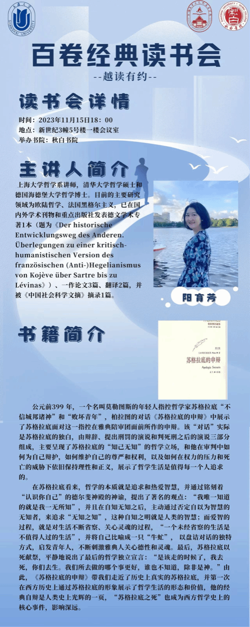 2023年11月15日下午,买球官方网站秋白书院“百卷经典读书会”活动在宝山校区新世纪3幢5号楼一楼会议室顺利举行,由此拉开了一系列分享与讨论的帷幕。本次读书会以著名哲学家柏拉图的典籍《苏格拉底的申辩》为主要内容,由买球官方网站哲学系阳育芳老师主讲,与会师生共8人参加。读书会主要分为教师分享与学生交流两个环节。