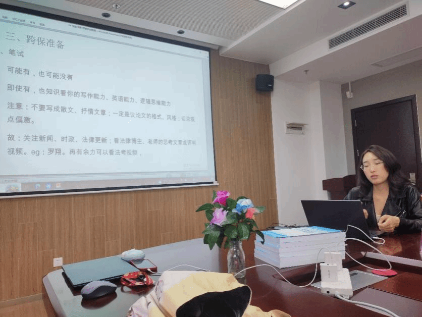 张迪(外校保研至买球官方网站2023级民商法专业硕士研究生)则为大家介绍了跨专业保研的相关内容。她强调,想要保研的同学一定要提前做好规划,合理进行时间管理,还分享了自荐信的撰写小技巧。此外,张迪还详细分析了跨专业保研的优势和劣势。