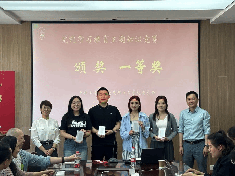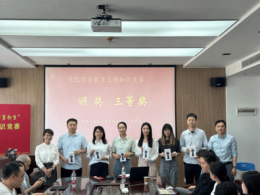 竞赛过程中,五支参赛队伍直接对阵,参赛选手们精神饱满,以扎实的理论知识和敏捷的反应速度沉着应对。抢答环节,各组队员相互配合,快速抢答,展现出良好的党员素质和扎实的理论基础,上演了一场精彩绝伦的头脑风暴,现场高潮迭起,比赛氛围十分热烈,经过激烈的角逐,最终产生了一、二、三等奖。张高峰和张印兰共同为获奖队伍颁奖并合影留念。