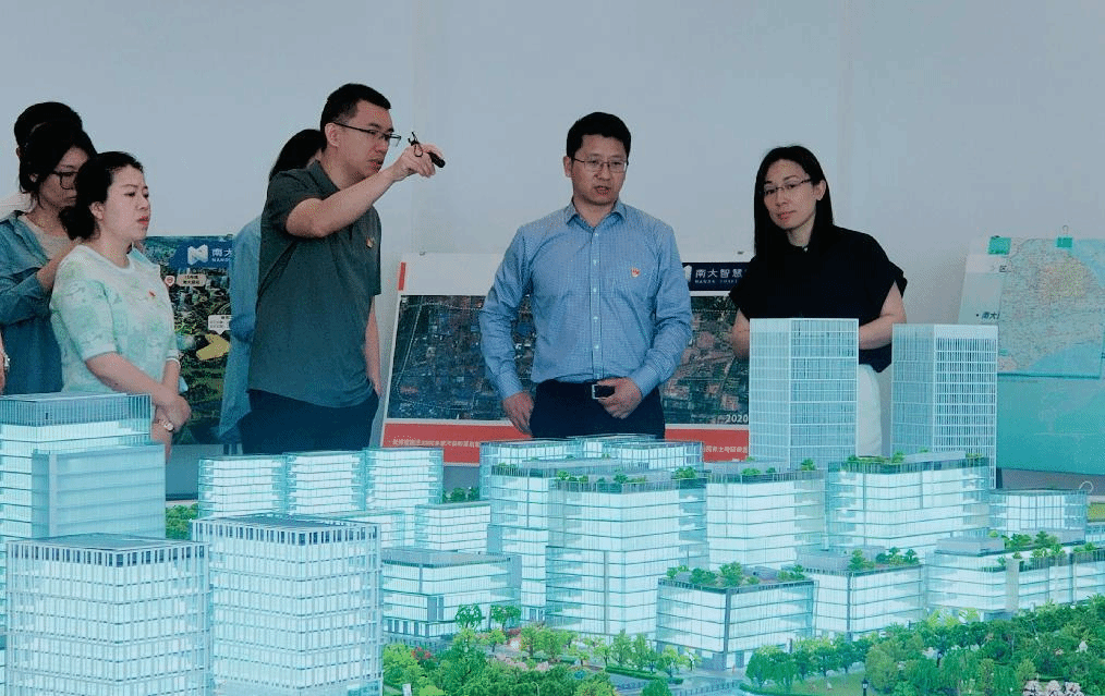 临港南大公司赵静首先带领全体人员参观南大智慧城“沙盘模型”,登高俯瞰南大智慧城建设全貌,详尽介绍南大区域的交通规划、产业定位、功能优势及未来发展方向。随后,产业发展促进中心葛永军基于上海“北转型”城市空间新格局的发展,系统介绍临港集团西北片区开发历程、园区布局、产业聚焦和发展成就。