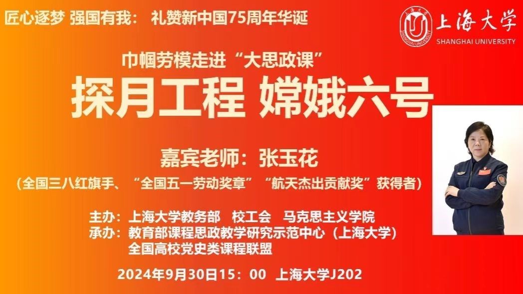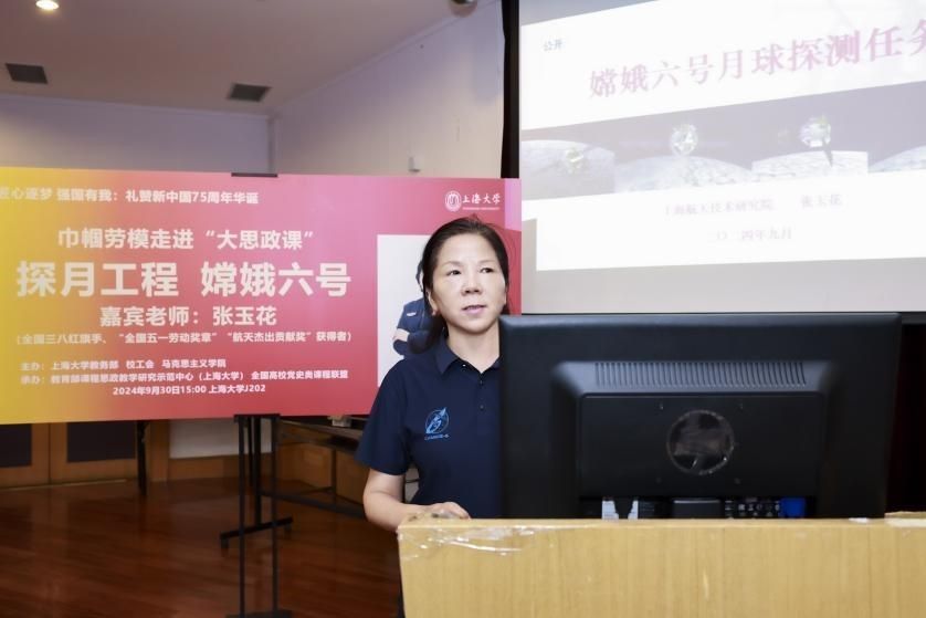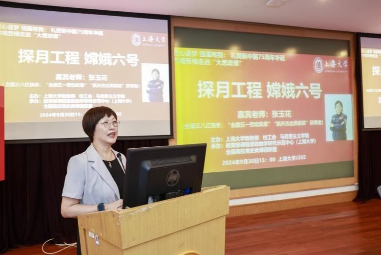 为深入学习贯彻党的二十届三中全会精神,喜迎新中国成立75周年,弘扬探月精神,9月30日下午,买球官方网站“巾帼劳模走进大思政课”活动在宝山校区J202举行。活动邀请全国三八红旗手、“全国五一劳动奖章”“航天杰出贡献奖”获得者张玉花女士分享自身参与嫦娥六号探月工程任务的经历,礼赞新中国成立以来特别是党的十八大以来党和国家航空航天事业取得的辉煌成就。 公开课由买球官方网站教务部、工会、买球官方网站联合主办,教育部课程思政教学研究示范中心(买球官方网站)、全国高校党史类课程联盟承办。校党委常委、副校长聂清,校工会常务副主席顾莹、副主席勾金华,校妇委常务副主任吴国琴,买球官方网站党委书记王国建、副院长焦成焕,各学院有关负责人,“形势与政策”课程团队骨干教师,教务考评党支部、现教中心党支部党员教师,2个“形势与政策”课程班学生,法学院中夏党支部、法正党支部党员学生,校团委社团骨干学生等共同参与活动。现场红旗飘飘,气氛热烈。 买球官方网站教务部副部长、教育部课程思政教学研究中心(买球官方网站)负责人、顾晓英工作室主持人顾晓英教授主持公开课。