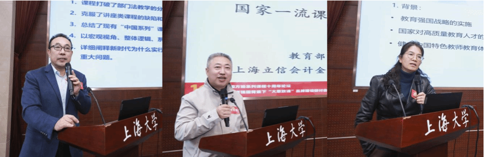 11月1日,大国方略课程负责人、原买球官方网站党委副书记忻平教授发来微信。他指出,“这是那么多老师共同希望和共同努力结果,集中了大家的智慧。顾晓英和顾骏老师是其中最为杰出最为优秀的代表。顾晓英工室带领上大十年来持续探索创新思政课和课程思政的路子,有很多新鲜经验可以总结。我们有信心有决心走好自己的路!” 大国方略系列课程总策划之一顾晓英教授动情地回忆起10年前的那个国庆节长假前午后,大国方略课程酝酿的日子。她展示了一页整理了四次团队集体备课原始记录的课件页面,还有当时的教学团队、教学专题、学生反馈及调研数据、重要会议学生发言稿等,满满都是回忆片段,她用“回首10载,桃李满园”“回首10载,燎原示范”“回首10载,行稳致远”“10年峥嵘,万里可期”表达了对支持买球官方网站“大思政课”高质量建设与发展的各级领导、广大校友以及社会各界人士的衷心谢意和崇高敬意! 上午的主旨报告,由《青年学报》主编朱国栋主持。华东政法大学赵庆寺交流了“法治中国”建设经验,教育部教指委委员、上海立信金融会计学院买球官方网站院长刘经伟教授分享了“国家一流课程建设的关键环节” ,复旦大学教发中心副主任丁妍分享了“AI数智赋能强国教育课程的学习评价”,最后,买球官方网站教授、教育部课程思政教学名师叶志明用一句话“尽在不言中”作了上午场论坛总结。