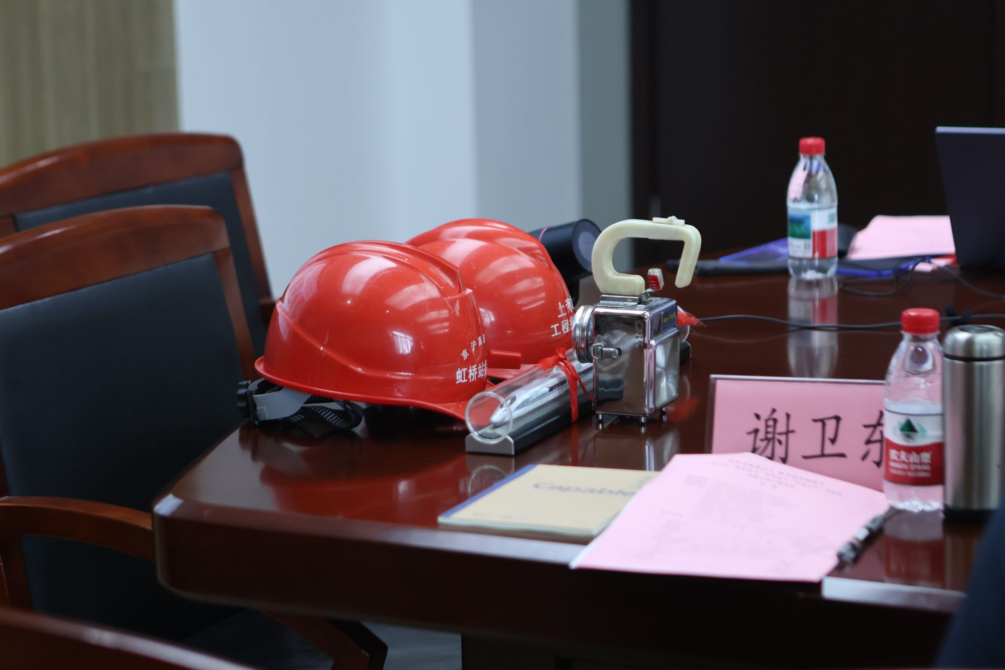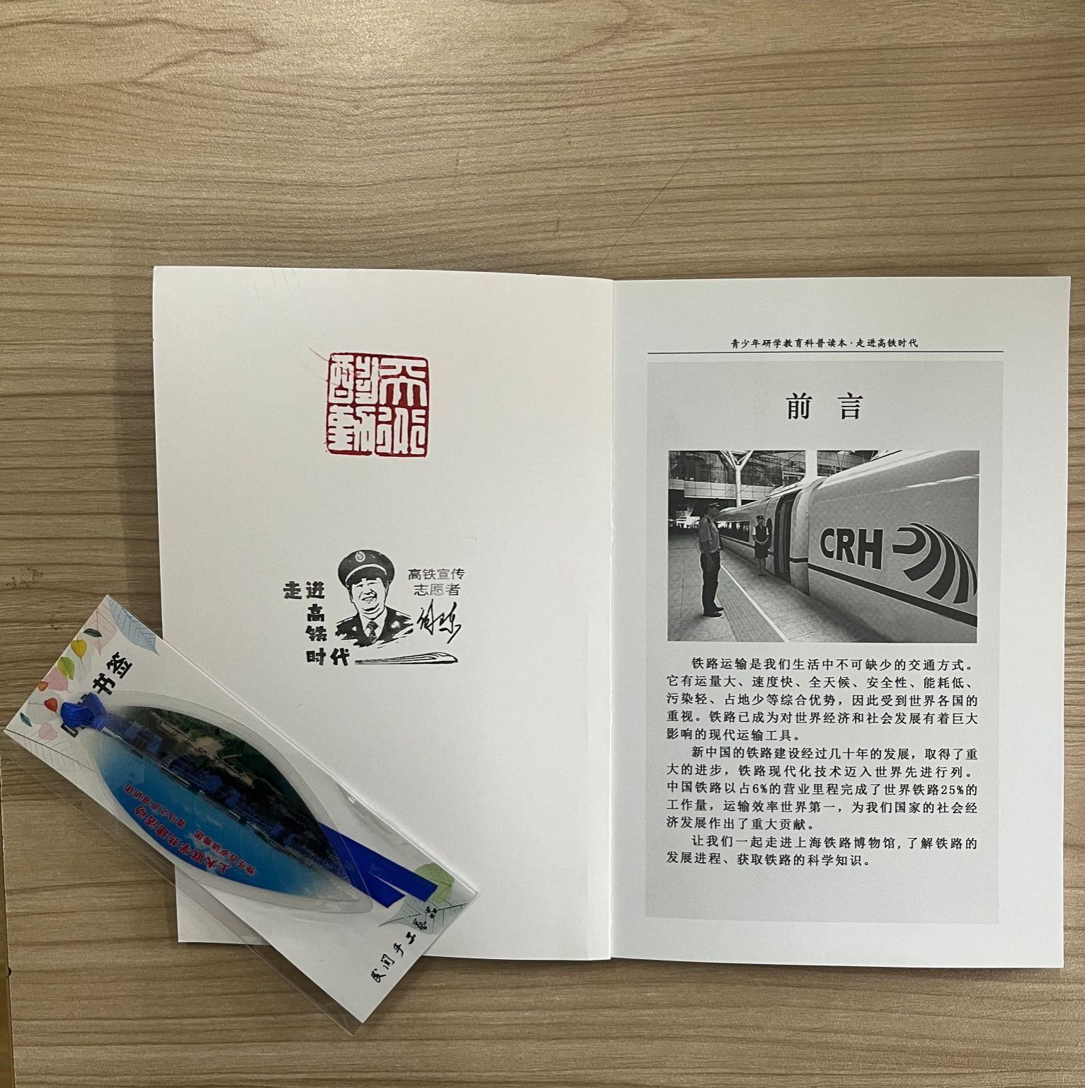 (上图为谢卫东带来的高铁科普书籍与制作的文创书签和工作时安全帽)
