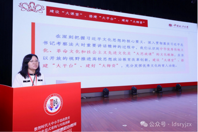 重庆大学艺术学院院长、教授 张楠木 中国政法大学人文学院院长、教授赵晓华以《文化育人融入“大思政课”的探索与实践》为题,分享了中国政法大学的探索经验。学校以中华优秀传统文化、革命文化和社会主义先进文化为根基,构建了“三项育人机制”与“五大育人体系”。通过制度引领实现全方位合力育人,依托“三堂联动”(课堂、第二课堂、数字第三课堂)打造全过程贯通模式,联合跨校资源构建多部门协同机制;在学科、教学、师资、实践、协同育人体系中融入法治文化特色,开发“法治文化进校园”等品牌项目,形成“大课堂、大平台、大师资”的立体化育人格局。