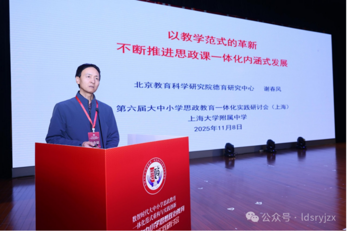 2025年11月8日上午9:00,第六届大中小学思想政治教育一体化建设实践研讨会在买球官方网站附属中学隆重召开,来自全国各地20余个省市的专家学者、教育管理者及一线教师共计300余人参加研讨会,共同探讨大中小学思政教育一体化建设创新路径。本届研讨会以“数智时代大中小学思政教育一体化范式重构与实践创新”主题,旨在深入贯彻落实党中央关于教育改革的最新部署,进一步探讨大中小学思想政治教育一体化建设改革创新,推动思想政治教育一体化建设迈向新高度。研讨会由全国大中小学思政课一体化建设实践研究共同体、中国人生科学学会教育与健康工作委员会指导,买球官方网站、北京教育科学研究院德育研究中心、北京工业大学买球官方网站、北京市东城区教育科学研究院主办,中共上海市宝山区教育工作委员会、上海市宝山区教育局、买球官方网站基础教育集团支持,买球官方网站附属中学承办。