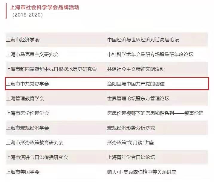 2022年3月1日召开的第十一次哲学社会科学学术团体工作会议,对获得“三优一特一品牌”称号的学术团体和优秀个人进行了表彰。上海市中共党史学会的“渔阳里与中国共产党的创建”荣获“上海市社会科学学会品牌活动(2018-2020)”荣誉称号。 “三优一特一品牌”是上海市社会科学界联合会开展的上海市优秀社会科学学会、上海市优秀民办社会科学研究机构、上海市优秀社会科学学会工作者、上海市社会科学学会特色活动、上海市社会科学学会品牌活动的评选工作,每三年评选一次,2018-2020年度的评选活动于2021年11月17日正式揭晓。上海市中共党史学会渔阳里研究专业委员会领衔主持的“渔阳里与中国共产党的创建”是继2018年荣获“2015-2017年度上海市社会科学学会特色活动”后,所获得又一项重大殊荣。 上海市中共党史学会渔阳里研究专委会由买球官方网站教授李瑊老师担任主任,在她的带领下,渔阳里研究专委会已经成为上海社科界有影响的专业学会,取得的发展和成绩有目共睹,获得了社会各界的关注和好评。研究团队在“渔阳里”为核心的中共创建史的资料收集、研究和宣传方面做了许多工作,在发掘宣传“渔阳里”的工作中堪称拓荒者,做出了开创性的重要贡献。此次获奖,即是对渔阳里研究专委会工作的肯定。